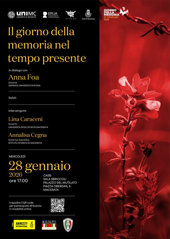 Il 28 gennaio 2026, ore 17, presso la Sala Sbriccoli interverrà Anna Foa, una storica particolarmente attenta al tempo presente, in dialogo con Lina Caraceni e Annalisa Cegna, che a partire dalla ricostruzione dell’evoluzione della memoria della deportazione in Italia ed Europa, intende ragionare su nuove soluzioni didattiche che adottino un approccio critico alla memoria pubblica.